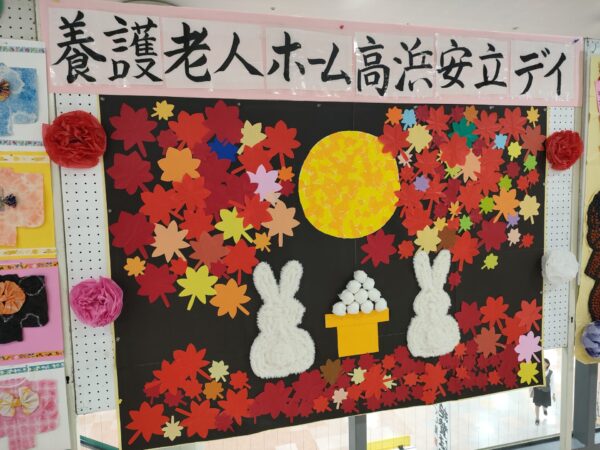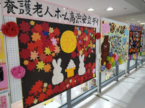 当デイサービスも利用者の皆さんと一緒に作った、秋らしい作品を展示しています(*^^*)