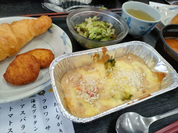 メニューは…クロワッサン、海老グラタン、ナゲット、アスパラサラダ、トマトスープ!!