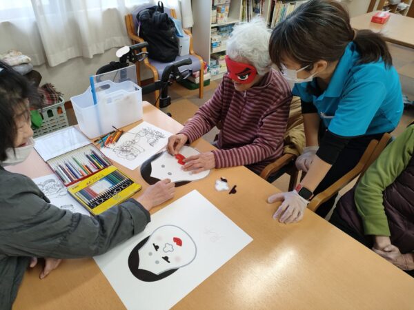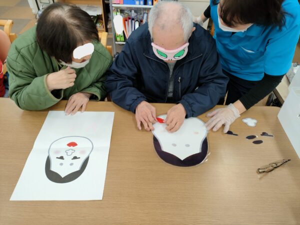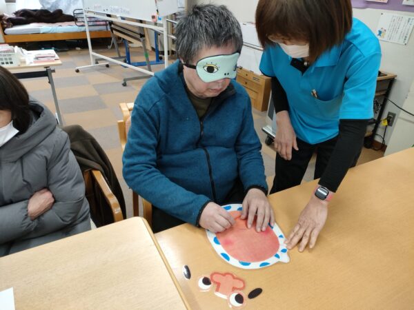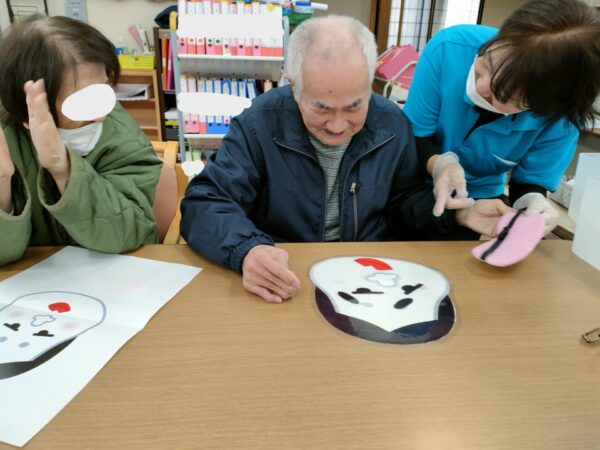 今日のレクリエーションはお正月らしく『福笑い』を行いました(*^^)v